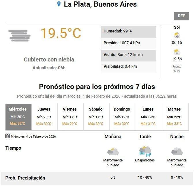 Para hoy la temperatura oscilará entre los 20 y los 32 grados. Será una jornada mayormente nublada, y ya después del mediodía se esperan nuevamente chaparrones, con 40% de probabilidades según el SMN. Además se esperan vientos moderados del este y ráfagas que por la noche alcanzarían los 50 kilómetros por hora.