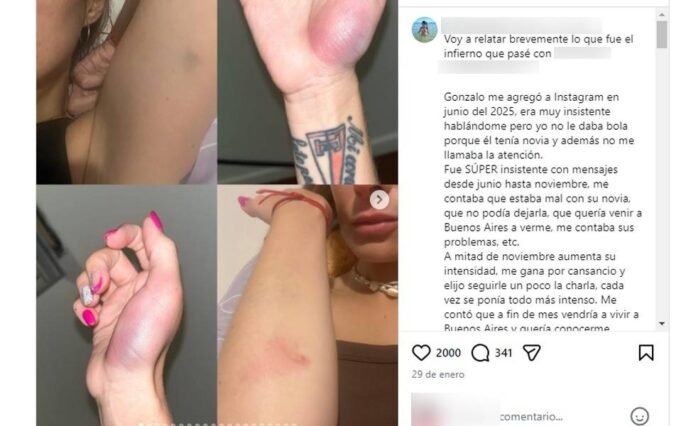 La joven contó que Gonzalo la contactó por redes sociales y que, tras meses de insistencia, accedió a conocerlo. “Yo no quería verlo, pero ante sus manipulaciones cedí y ahí comenzó el verdadero infierno”, expresó.