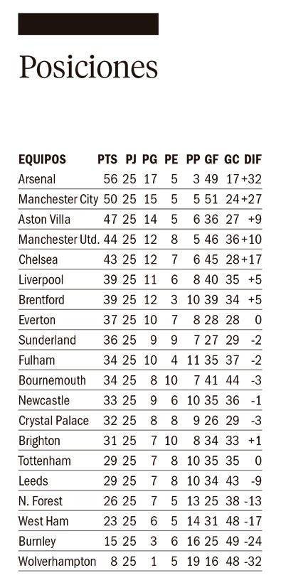 Por su parte, el Liverpool, que contó con la titularidad del mediocampista argentino Alexis Mac Allister, quedó sexto posición con solo 39 puntos.