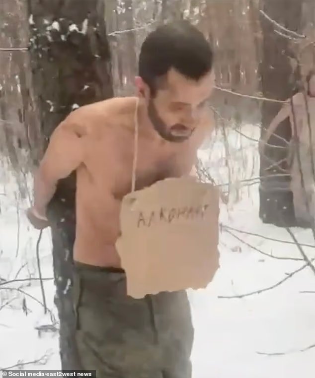 En enero, apareció un vídeo que mostraba a un caza ruso atado boca abajo a un árbol en el frío cortante cerca de la línea del frente.