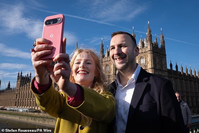 El líder del Partido Verde, Zack Polanski, posa para una selfie frente al Parlamento el lunes con la nueva diputada Hannah Spencer, quien ganó las elecciones parciales de Gorton y Denton la semana pasada.