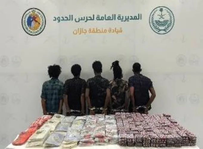 Las patrullas salvajes de los guardias fronterizos en el sector circular en la area de Jazán arrestaron (5 infractores del sistema de seguridad fronteriza de nacionalidad etíope, para contrabando (60 kilogramos de narcóticos hashish, y (33, 736 las tabletas sujetas a la regulación de la circulación médica, y los procedimientos regulares iniciales se completaron opposite ellos, y se entregaron y se entregaron y se sentieron para la jurada.