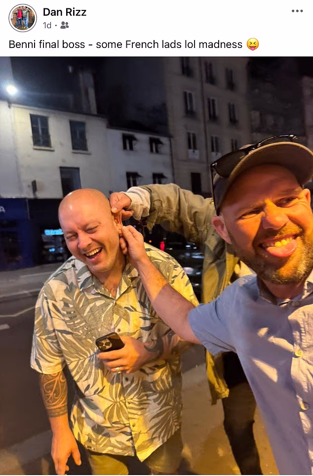 Vestido con una camisa hawaiana y agarrando su teléfono móvil, se puede ver a Ashley-Laws riéndose mientras dos amigos le agarran la oreja.