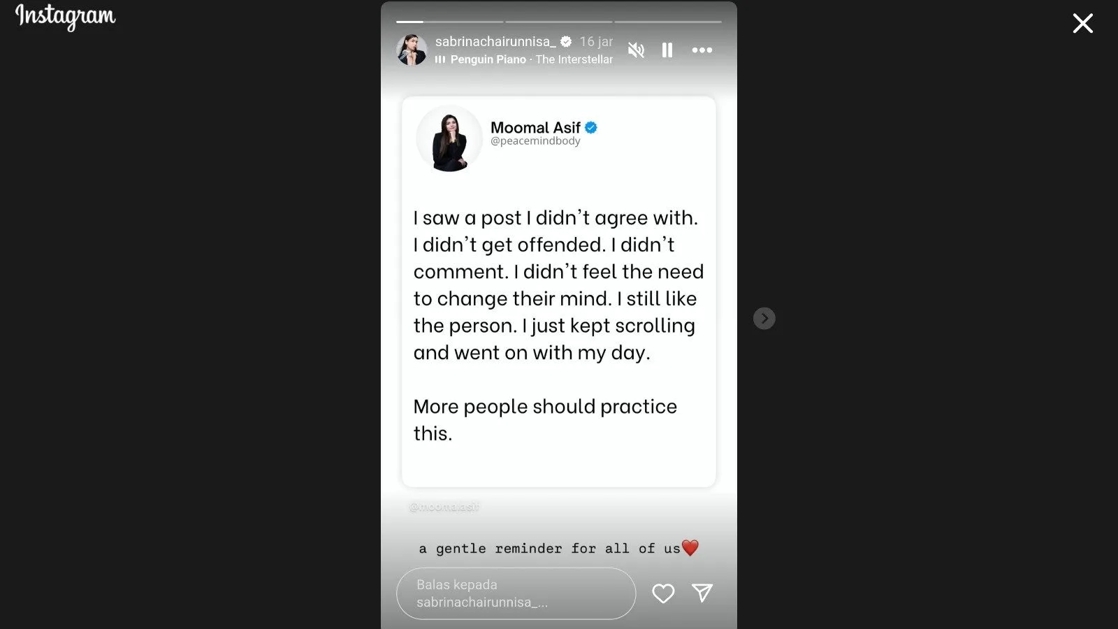 “Vi una carga y en desacuerdo. No me insulté. No comenté. No sentí la necesidad de cambiar de point of view. Todavía me gustan los humanos. Simplemente me gusta desplazarme y disfrutar de mi tiempo. Muchas personas deberían entrenar esto”, se citó la carga de Moomal ASIF a través de la cuenta de @Peacemindbody en Instagram Story Sabrina Presidnisa, el martes 30 de septiembre de 2025