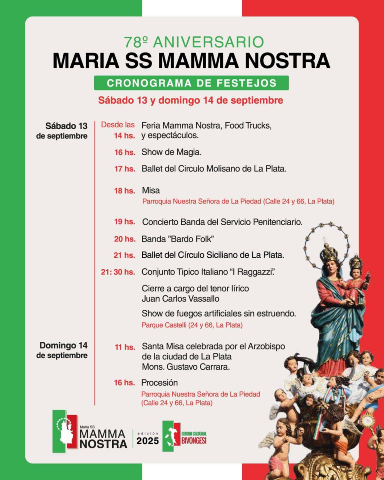 Los días sábado 13 y domingo 14 de septiembre, se realizará en las inmediaciones del Parque Castelli, la celebración del 78º Aniversario de María SS Mamma Nostra, patrona del pueblo calabrés de Bivongi. Un evento que reúne a la comunidad italiana de nuestra ciudad.