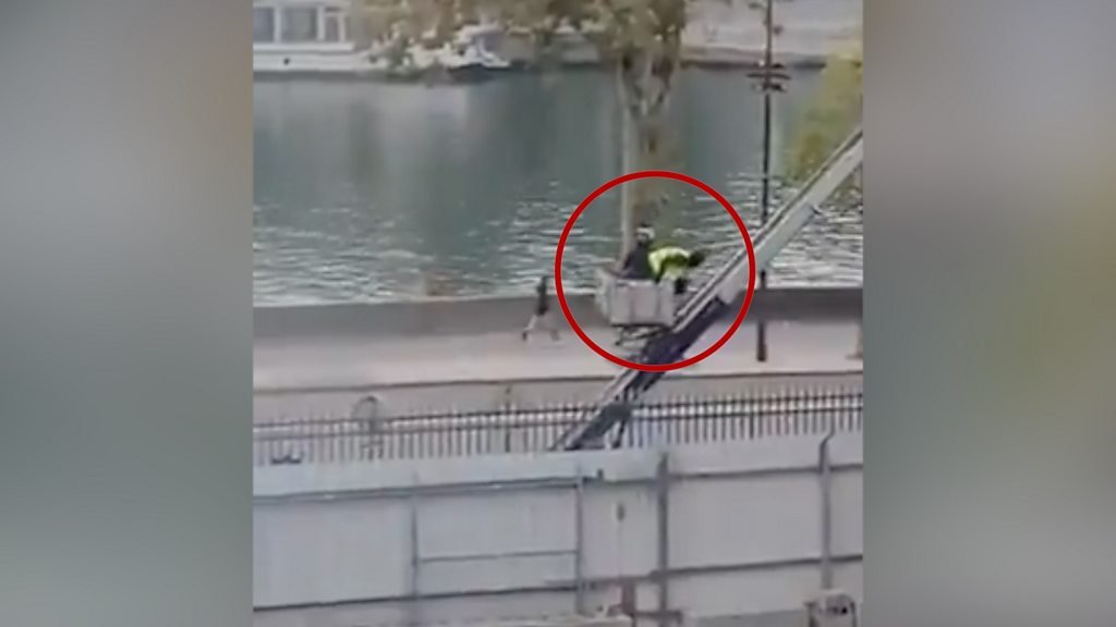 En el vídeo se ve el camión equipado con la escalera estacionado en una concurrida carretera que bordea el Sena mientras pasan los vehículos.
