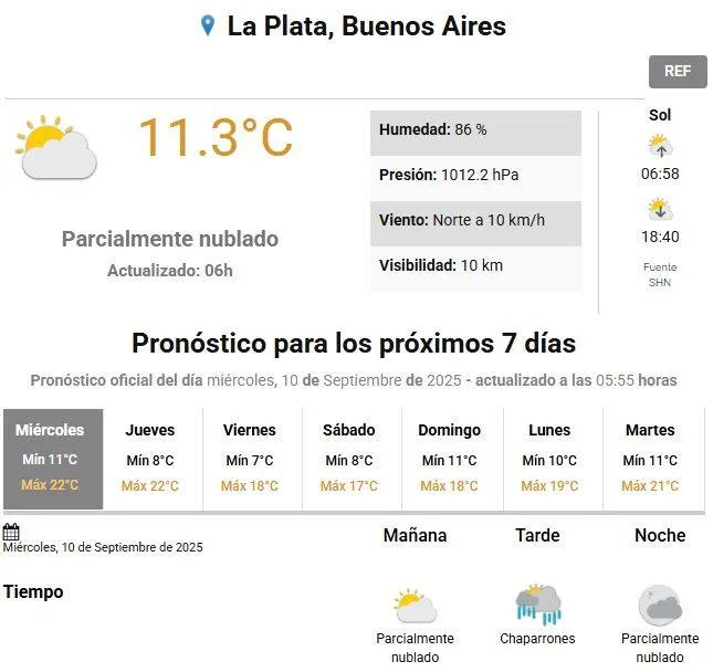 El Servicio Meteorológico Nacional (SMN) informó que se prevé en La Plata y alrededores un miércoles con cielo mayormente nublado parcialmente nublado desde la mañana y con probabilidades de chaparrones en la tarde.
