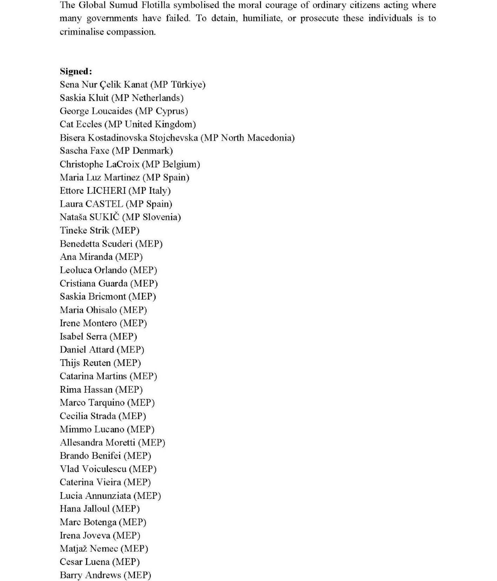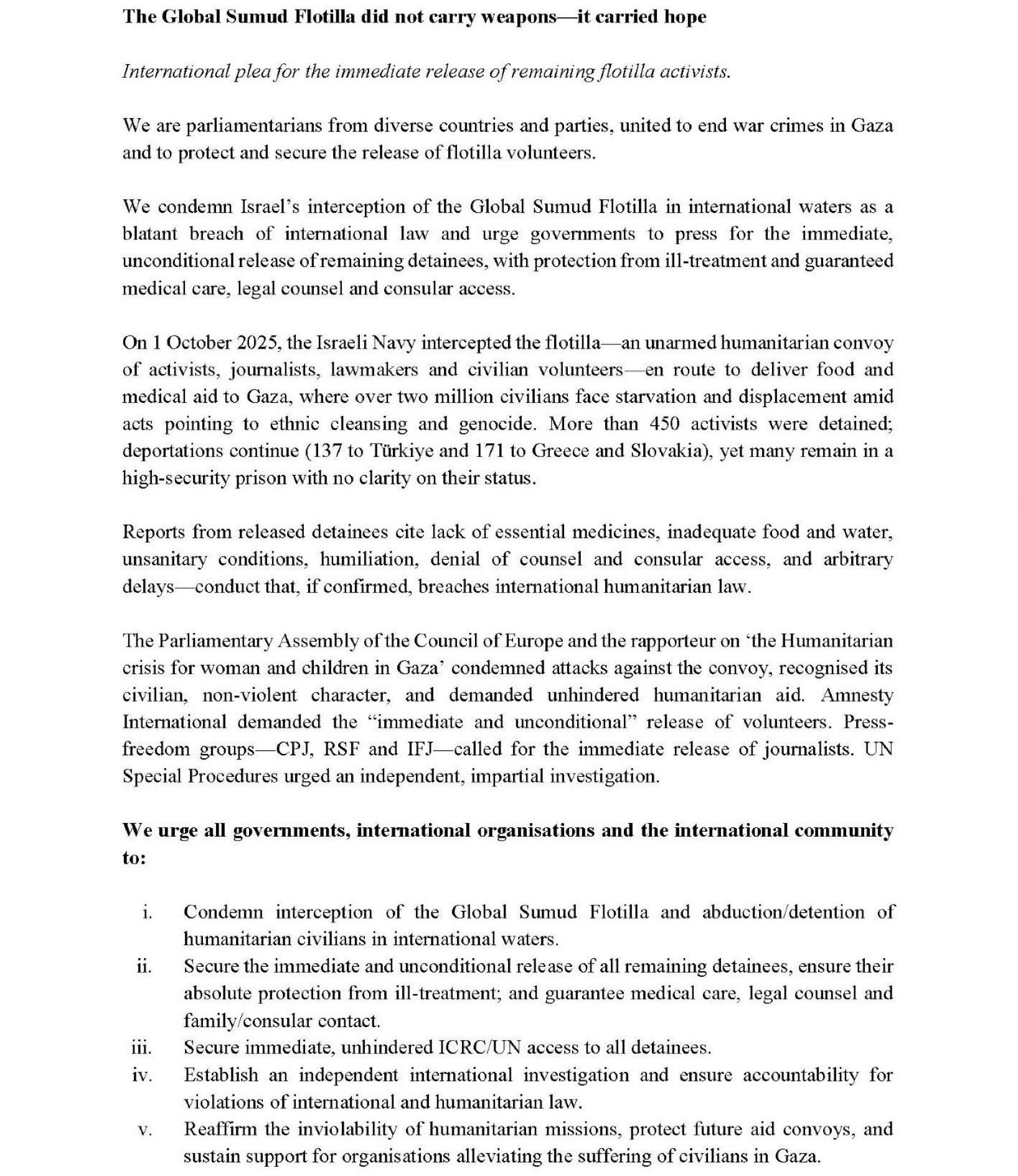 “La Flotilla Global Sumud no llevaba armas, llevaba esperanza”, decía la declaración, firmada por miembros de la Asamblea Parlamentaria del Consejo de Europa (PACE) y el Parlamento Europeo, describiendo la flotilla como un convoy humanitario pacífico de voluntarios, periodistas, legisladores y trabajadores humanitarios en ruta a Gaza cuando fue interceptada por la marina israelí en aguas internacionales el 1 de octubre.