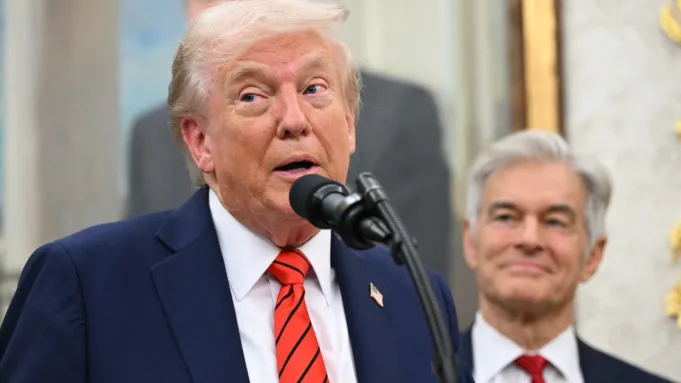 El presidente de Estados Unidos, Donald Trump, anuncia un acuerdo para reducir los precios de los medicamentos con el fabricante de medicamentos AstraZeneca mientras el administrador de servicios de Medicare y Medicaid, Mehmet Oz, escucha en la Oficina Oval de la Casa Blanca en Washington, DC, el 10 de octubre de 2025.