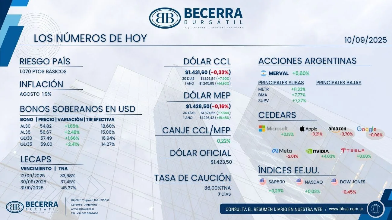 - Mercado local: Merval +5,6%, Cedears +0,42%, ADR +5%.