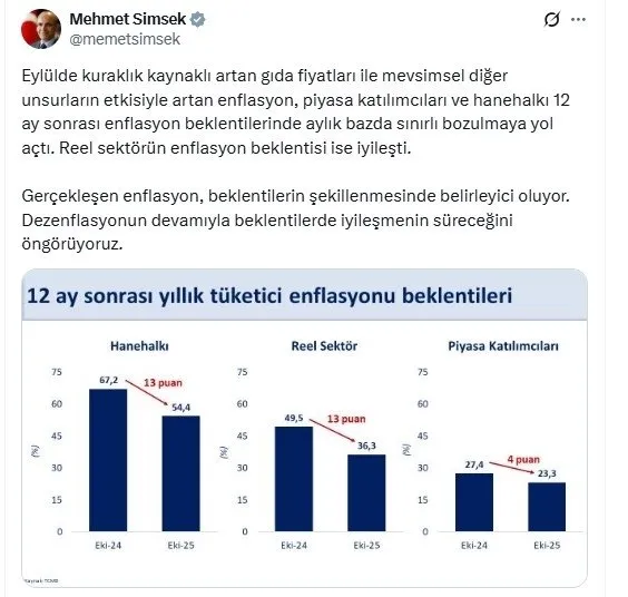 Ministro de Hacienda y Finanzas, Mehmet Şimşek, “La inflación real es decisiva a la hora de moldear las expectativas. Predecimos que la mejora de las expectativas continuará si continúa la desinflación”. dijo.