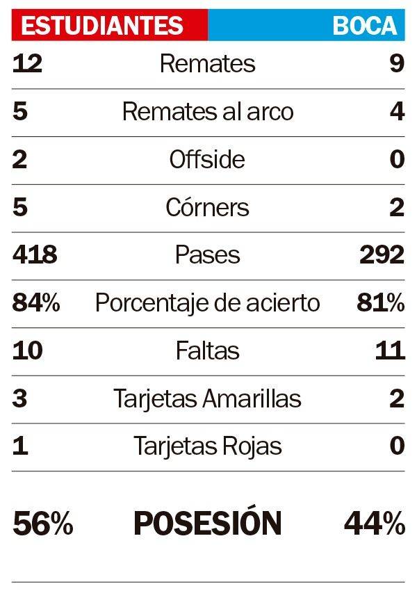 En el primer tiempo Estudiantes intentó ser dominador. Al menos manejó la pelota y trató de desbordar por las puntas, principalmente en la izquierda con Edwuin Cetré y Cristian Medina. No tuvo claridad ni apretó los dientes en los metros finales pero dejó mejor sensación. El problema es que en los minutos finales otra vez evidenció las falencias que tiene cuando su defensa se adelanta unos metros y llega un pelotazo frontal. No pudo ni supo Facundo Rodríguez cómo marcar al Changuito Zeballos, el único jugar de Boca que podía complicar: penal y el mismo jugador Xeneize que lo estrelló en el palo izquierdo. Zafó el equipo albirrojo.