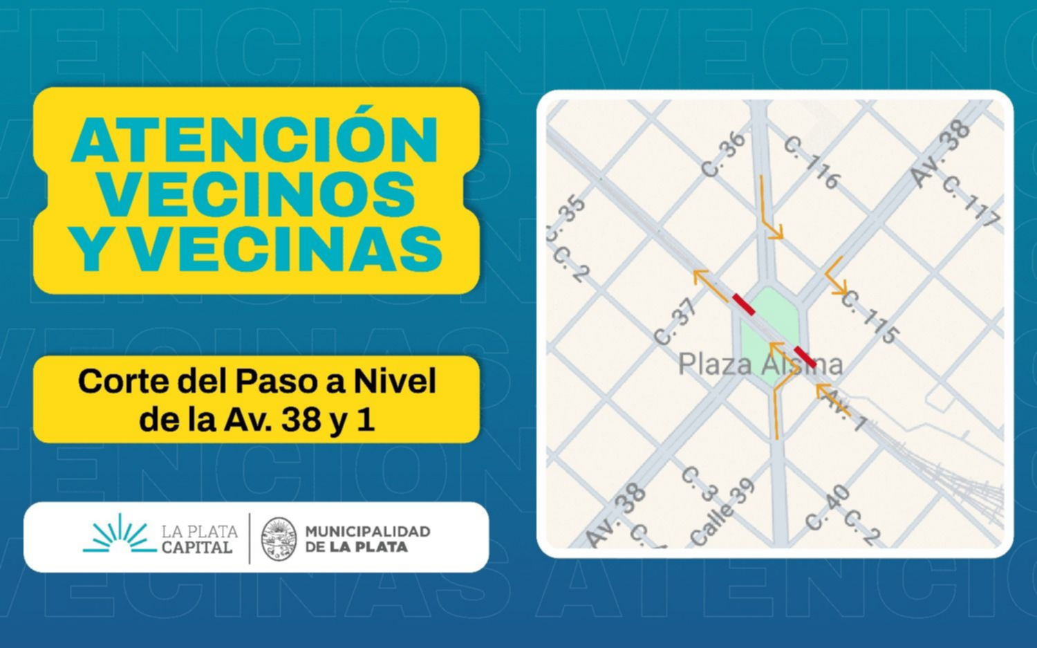 La Municipalidad de La Plata informa que a partir de esta noche permanecerá interrumpido el tránsito vehicular en el paso a nivel de avenida 1 y 38, en ambos sentidos, debido al avance de obras.