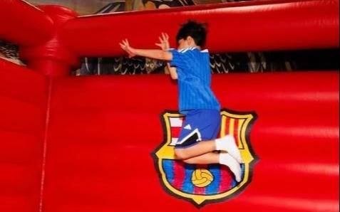 Ciro, el menor, se divirtió saltando en un gran inflable adornado con el escudo culé.