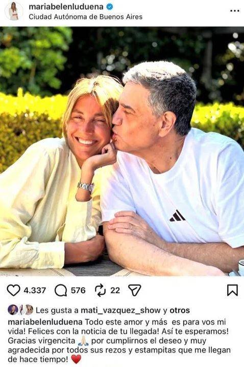 “Todo este amor y más es para vos, mi vida. Felices con la noticia de tu llegada. ¡Así te esperamos! Gracias virgencita por cumplirnos el deseo y muy agradecida por todos sus rezos y estampitas que me llegan desde hace tiempo”, escribió la conductora, acompañando el mensaje con un emoji de corazón rojo.
