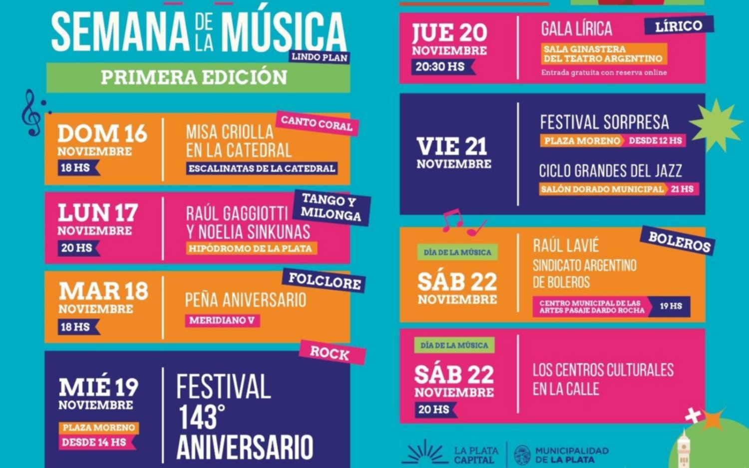 Con esta programación, la Ciudad se prepara para una semana en la que la música ocupará el espacio público y acercará una amplia diversidad de géneros y estilos a todos los platenses.