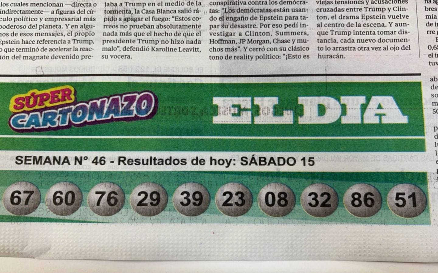 El Súper Cartonazo quedó vacante, acumula un pozo de 10 millones de pesos y este viernes se conoció la primera tanda de números de la ronda semanal del juego de EL DIA. Para esta jugada hay una novedad: si no hay ganadores con 15 aciertos, el pozo se irá con la tarjeta que llegue con 14.