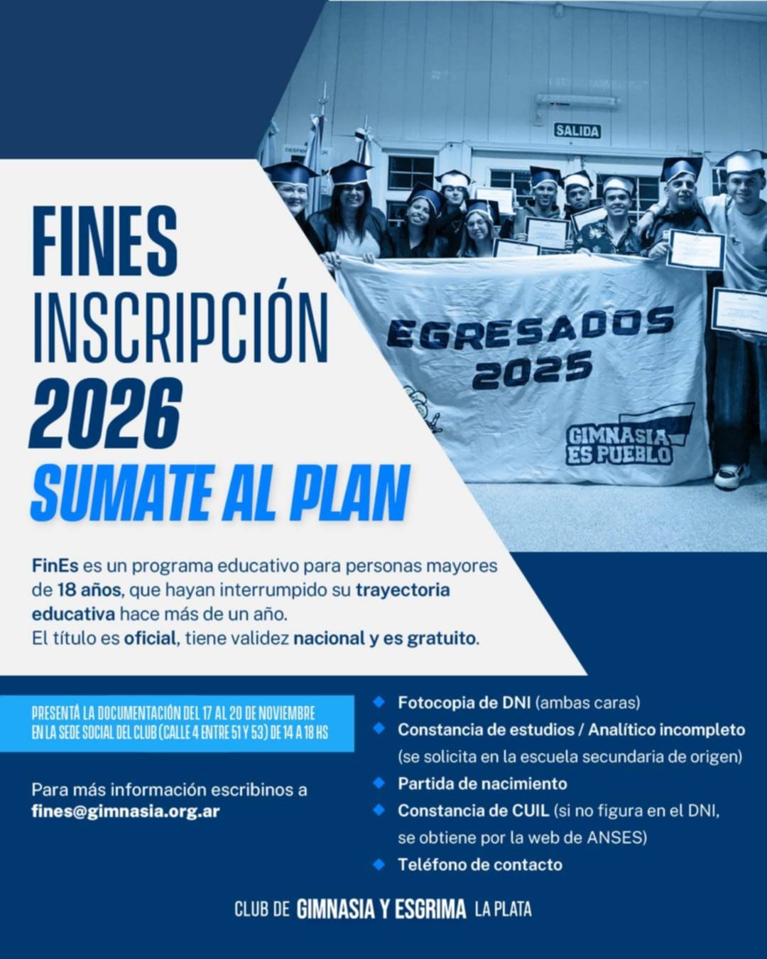 El Club de Gimnasia y Esgrima La Plata anunció la apertura de inscripciones para el Plan FinEs 2026, una propuesta educativa destinada a personas mayores de 18 años que hayan interrumpido sus estudios secundarios hace más de un año.
