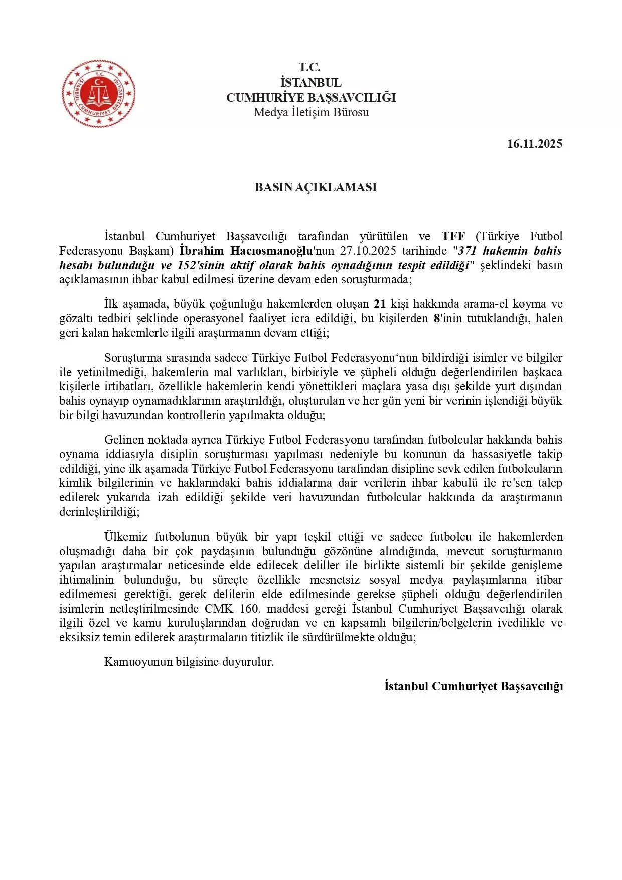 En la declaración de la Fiscalía General se afirma que el presidente del TFF, İbrahim Hacıosmanoğlu, se reunió el 27 de octubre. “Se determinó que 371 árbitros tenían cuentas de apuestas y 152 de ellos apostaban activamente”. En la investigación en curso, donde se aceptó el comunicado de prensa como un chivatazo, se afirmó que en la primera etapa se llevó a cabo un operativo mediante medidas de búsqueda, incautación y detención opposite 21 identities, en su mayoría árbitros, 8 de ellos fueron detenidos, y la investigación sobre los árbitros restantes aún continúa.