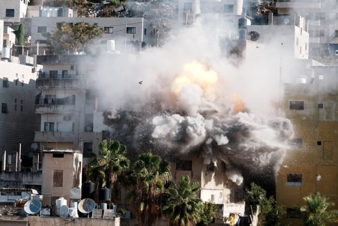 El humo se eleva mientras las fuerzas israelíes demuelen la casa de Abdul Karim Sanoubar, quien fue detenido por Israel por supuestamente planear atentados con bombas en autobuses, Nablus, Cisjordania ocupada, el 2 de diciembre de 2025. (Foto AFP)
