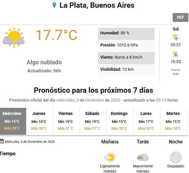 En lo que resta de la semana La Plata y alrededores experimentarán un marcado aumento de la temperatura. Este miércoles las marcas serán de entre 15 y 28 grados acompañadas de cielo ligeramente nublado a mayormente nublado por la tarde y vientos leves, informó el Servicio Meteorológico Nacional (SMN).