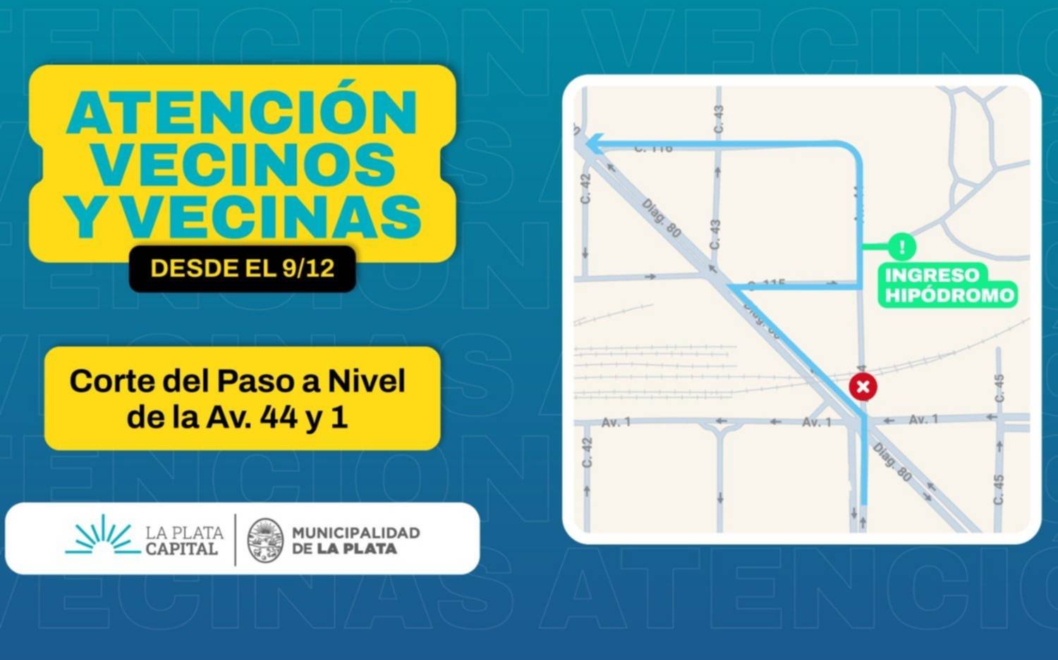 De esta manera, en caso de circular por 44 en sentido hacia 1 será obligatorio desviarse por diagonal 80 y retomar 44, mientras que aquellos conductores que circulen por 1 solo podrán girar a la derecha por diagonal 80 En ambos casos, para acceder al Hipódromo deberá tomarse la calle 115