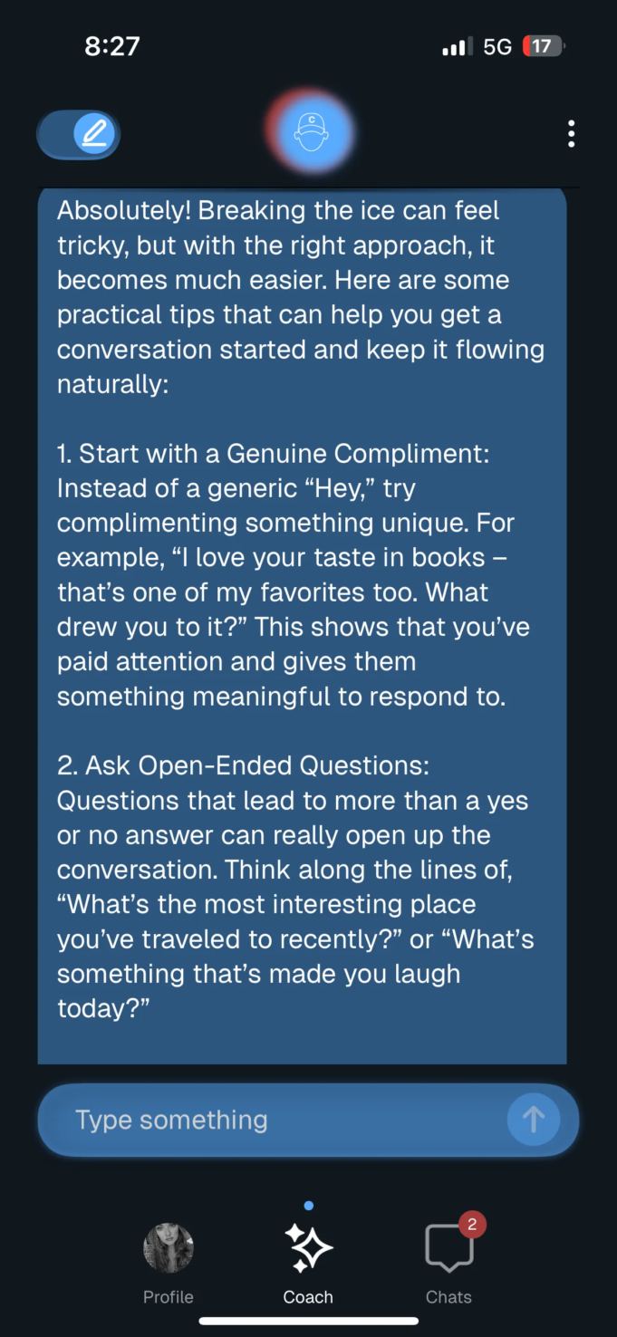 Si acepta, deberá esperar a que la otra identity acepte o pase la coincidencia, o ya habrá aceptado y podrá comenzar a chatear. Aquí, su entrenador de citas disadvantage IA interviene para desempeñar el papel de compañero, proporcionando indicaciones basadas en el perfil de la otra persona, resaltando las similitudes que tiene y dando preguntas de conversación basadas en las respuestas del perfil de la pareja. El entrenador no solo ofrece posibles actividades para romper el hielo (y respuestas), sino que también puedes charlar y pedir sugerencias.