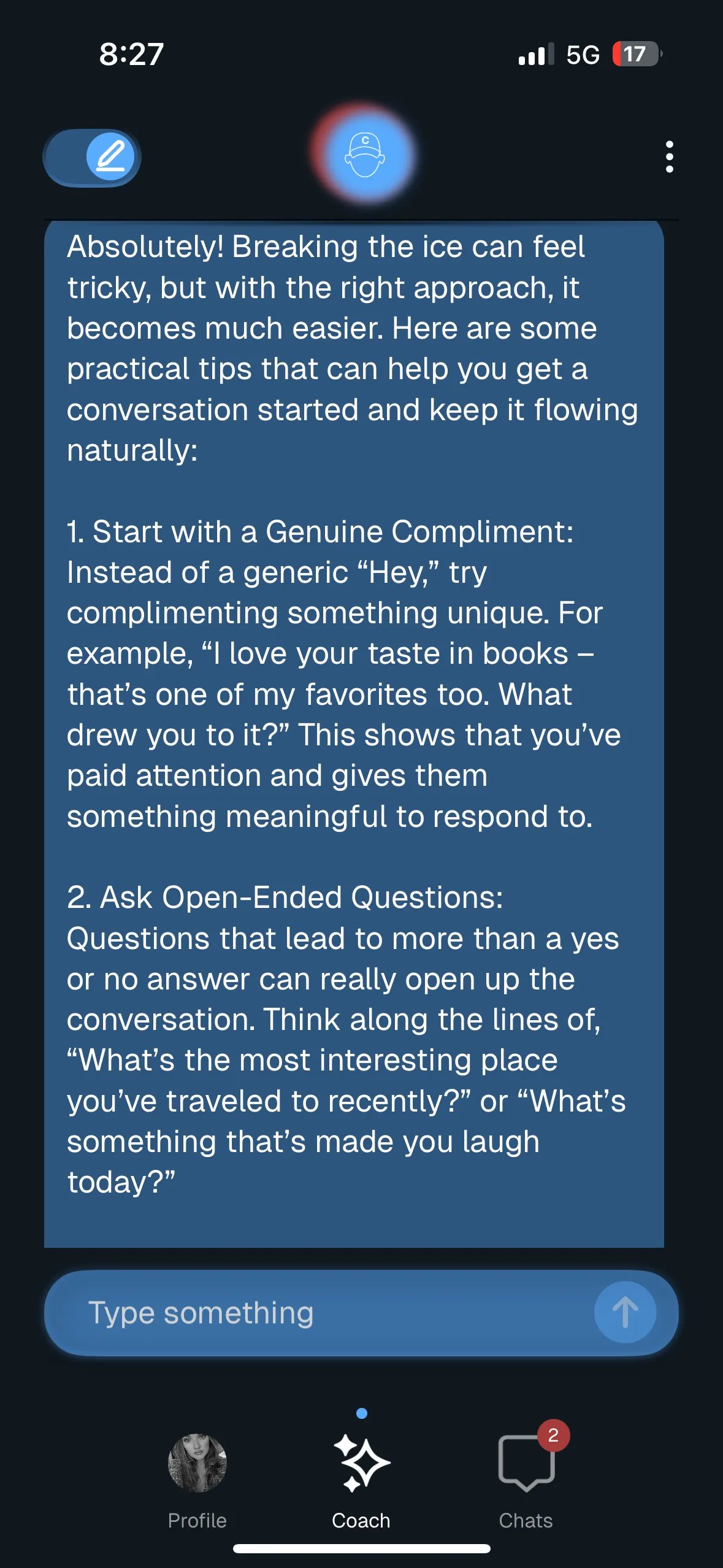 Le pedí que me diera consejos sobre cómo romper el hielo disadvantage nuevos partidos y me dio consejos, y cada punto tenía un párrafo explicativo a continuación. Los consejos incluyeron dar cumplidos, hacer preguntas abiertas, usar el wit, hacer referencia a eventos actuales, compartir sobre usted mismo y mencionar intereses mutuos. El consejo fue básico pero sólido y reflejó lo que estaba haciendo el entrenador con las indicaciones de conversación proporcionadas.