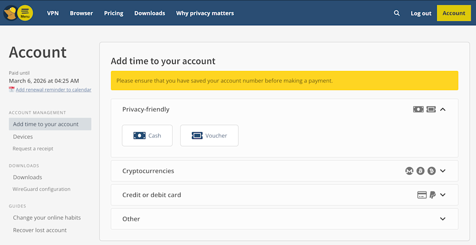 Cuando te registras en Mullvad, pagas por adelantado tantos meses como quieras a un tipo de cambio constante de 5 euros al mes (que varía según el tipo de cambio). Cada mes, Mullvad retira 5 euros de tu cuenta hasta que no queda nada. Si ya no está satisfecho con Mullvad, todo lo que tiene que hacer es dejar de invertir dinero.