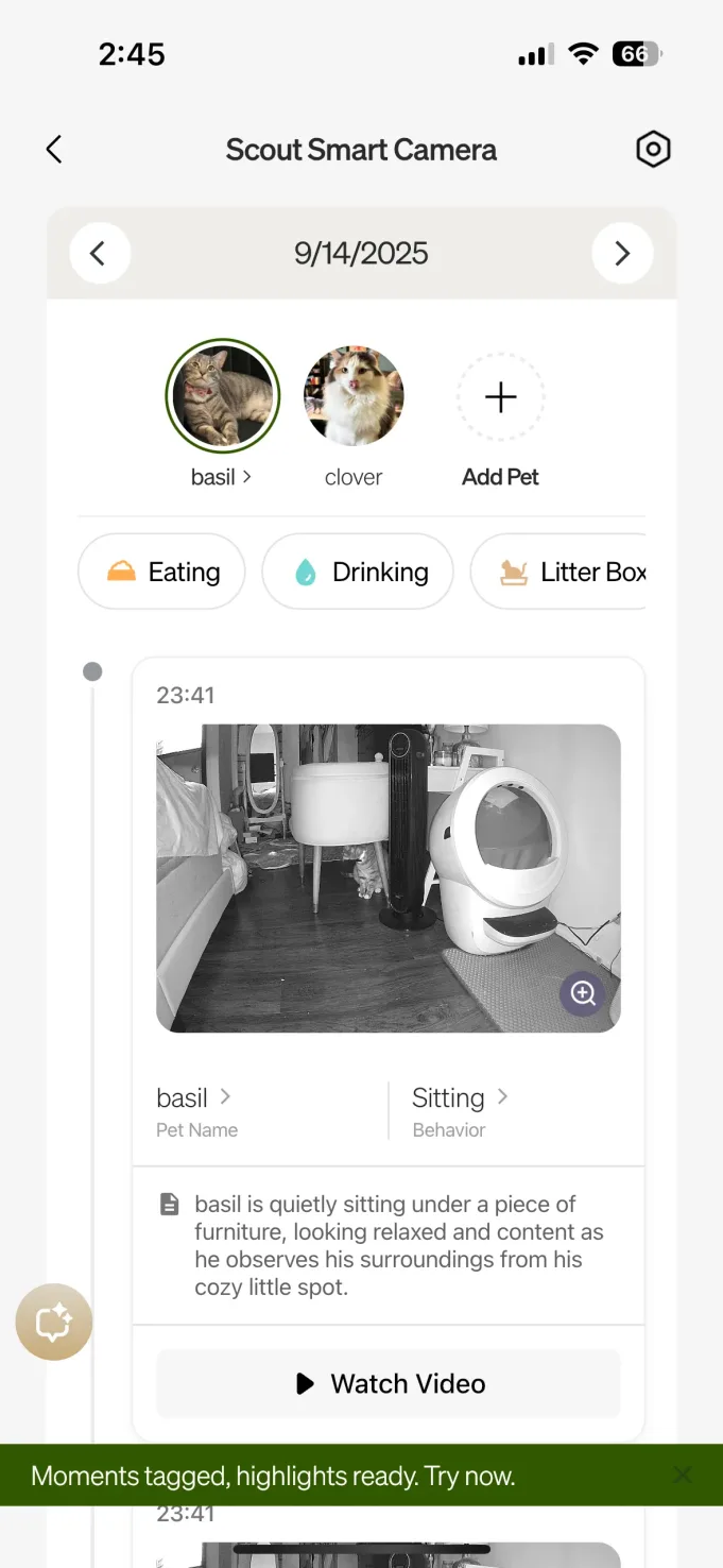 En gran parte de la prueba de tecnología de mascotas, faltan las aplicaciones conectadas. Pero ese no ha sido el caso con nada que he probado de Petlibro. A través de la aplicación, puede ver imágenes en vivo, ver clips organizados por día, mascota y actividad, y revisar los carretes destacados de 30 segundos de cada día. Las actividades son organizadas por PET y categorizadas por tipo: comer, beber, caja de arena, selfie, movimiento y otros (que generalmente eran solo mis gatos descansando en la cama). También puede enviar fácilmente comentarios sobre cada mascota y comportamiento con un clic de un botón, para que la IA pueda aprender a etiquetar correctamente a cada mascota y comportamiento.